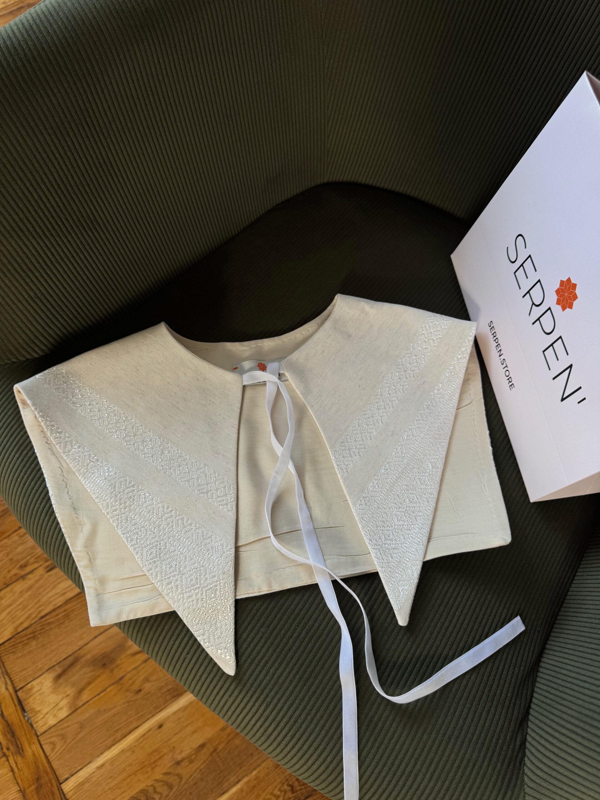 Витонченість у кожній деталі: жіночий комір SERPEN’ із дизайнерською машинною вишивкою, орнамент «ЕЛЕГІЯ 1» – це втілення елегантності та стилю завдяки унікальній комбінації бавовни, льону та поліаміду.