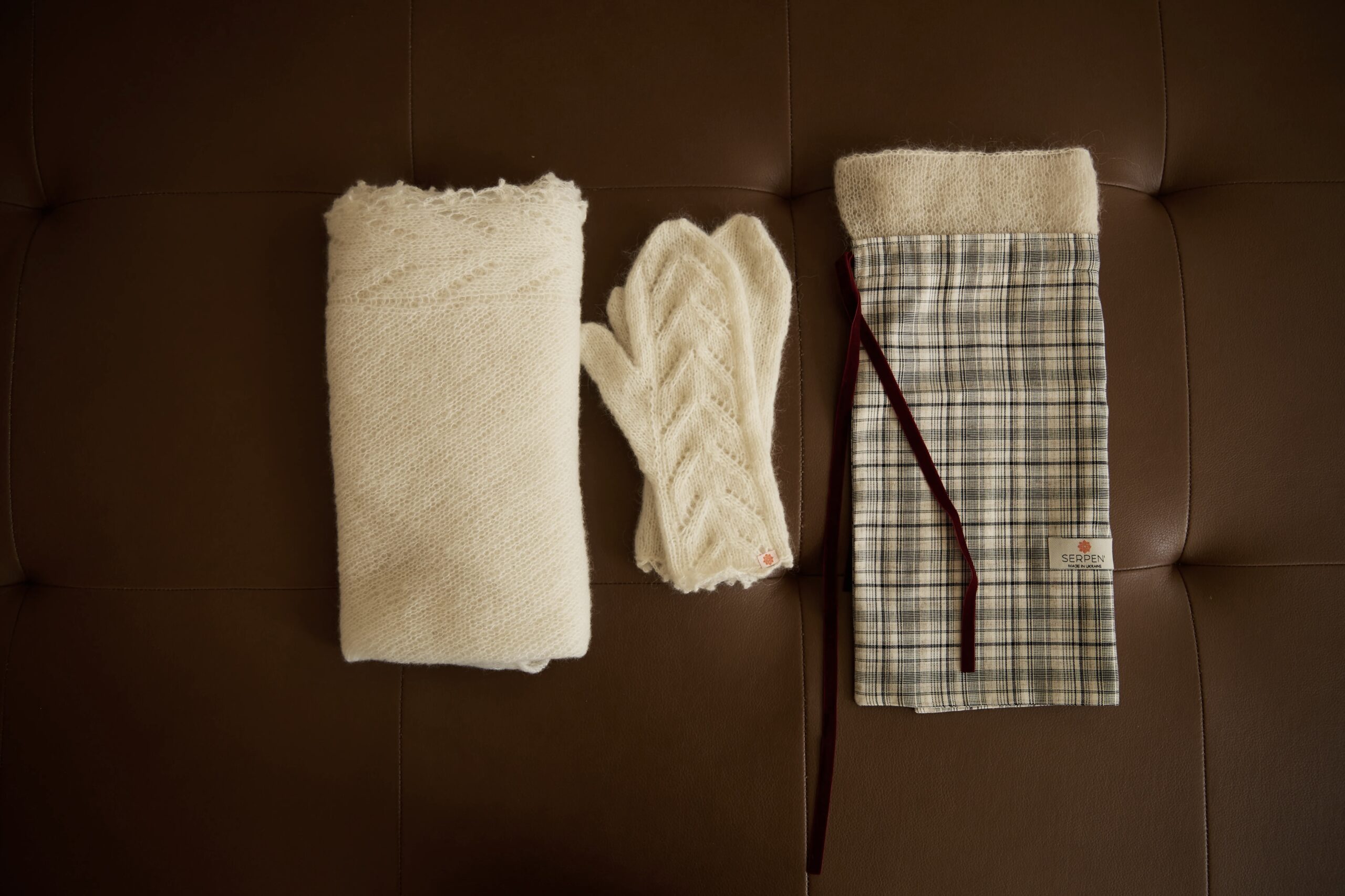 Ніжна в’язана хустина та рукавиці ручної роботи — втілення тепла, затишку та витонченості. Легкі, майже невагомі, створені з м’якої пряжі мериноса, що приємно дарує комфорт у холодну пору. Ажурний візерунок додає виробам елегантності й підкреслює його унікальність.