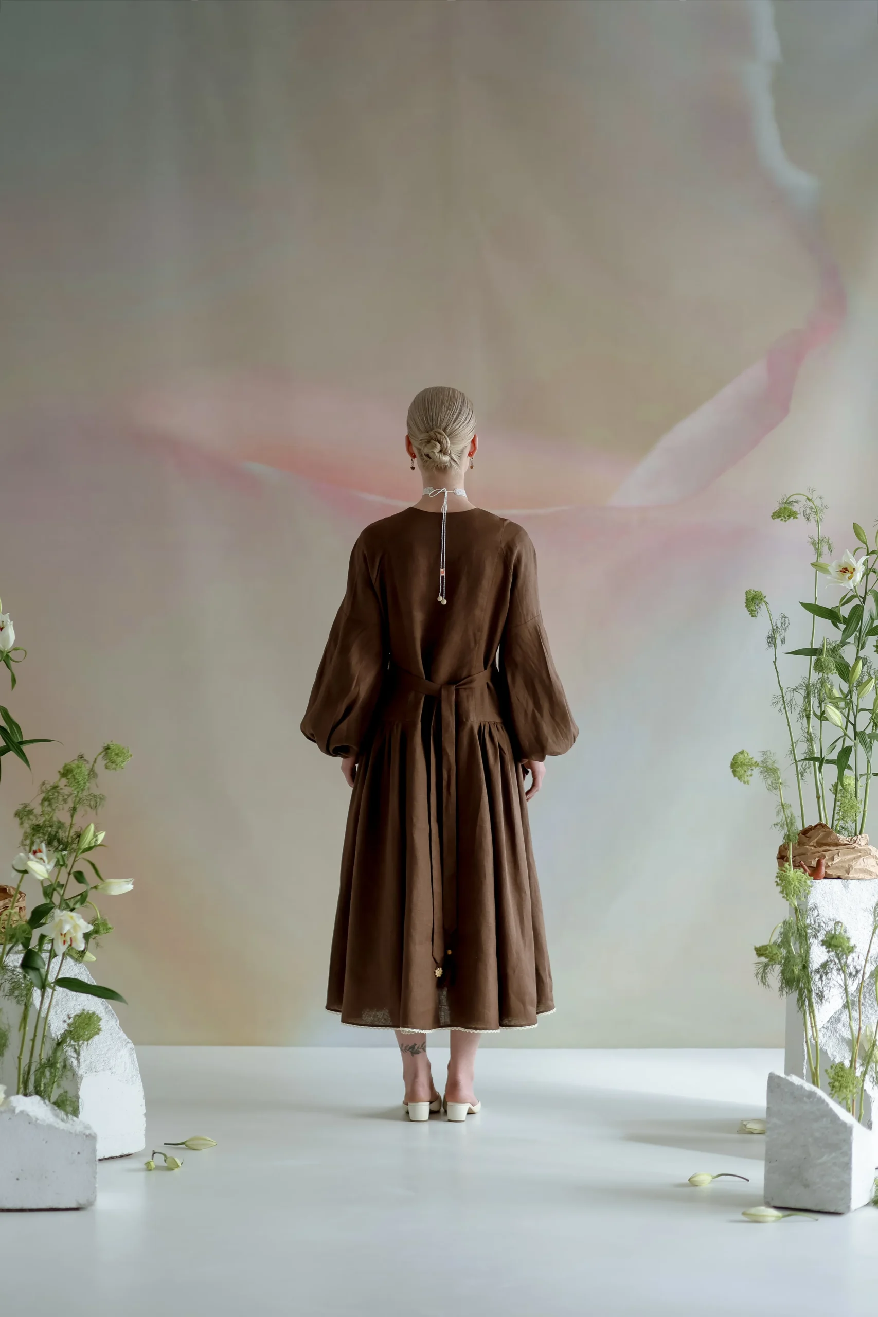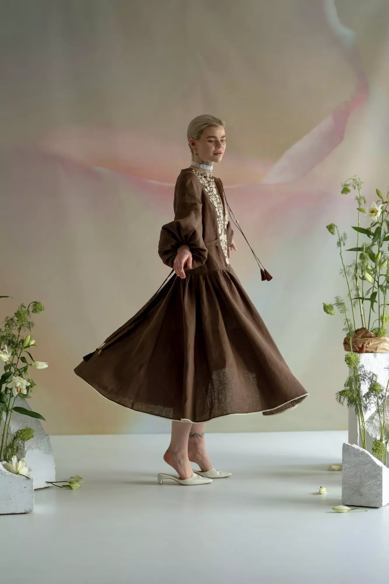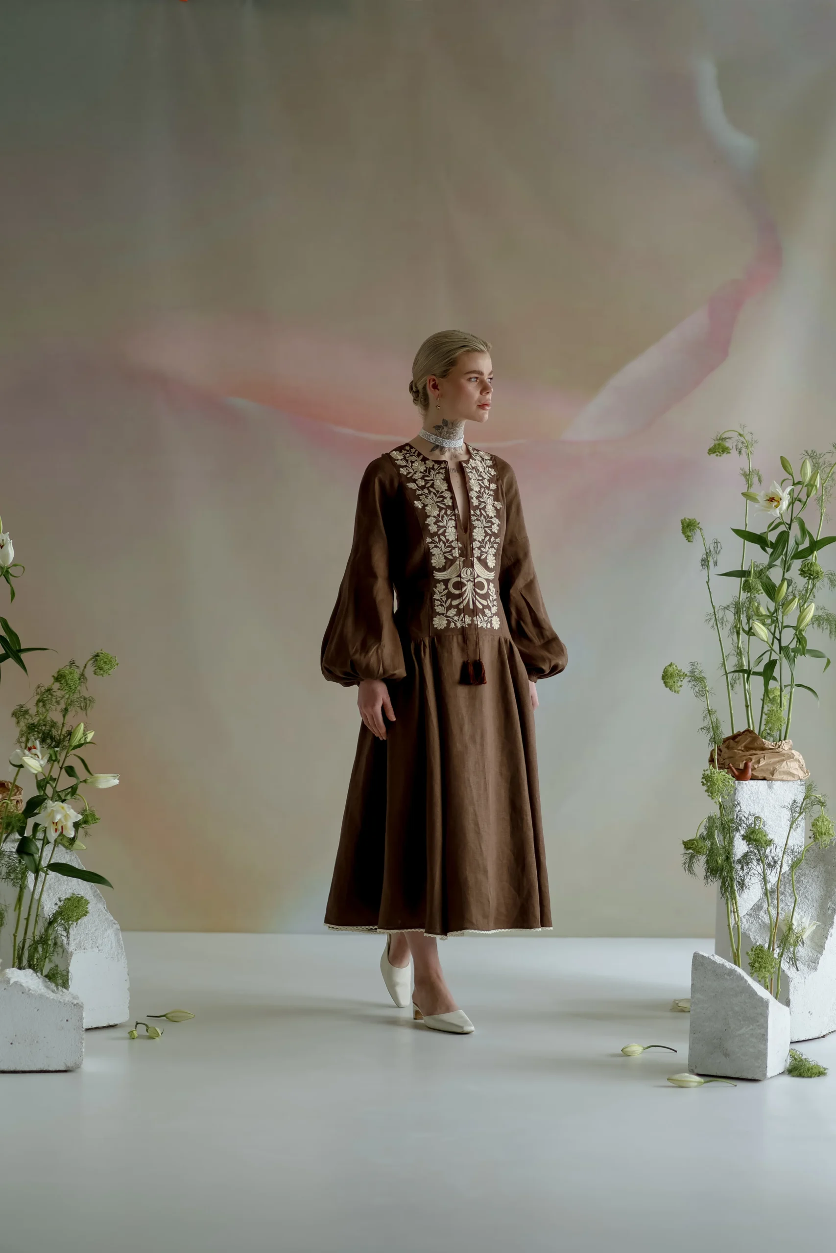 Силует сукні натхненний традиційним строєм – із виразною вертикаллю, акцентованим ліфом та розширеною до низу спідницею, що мʼяко тримає форму.
