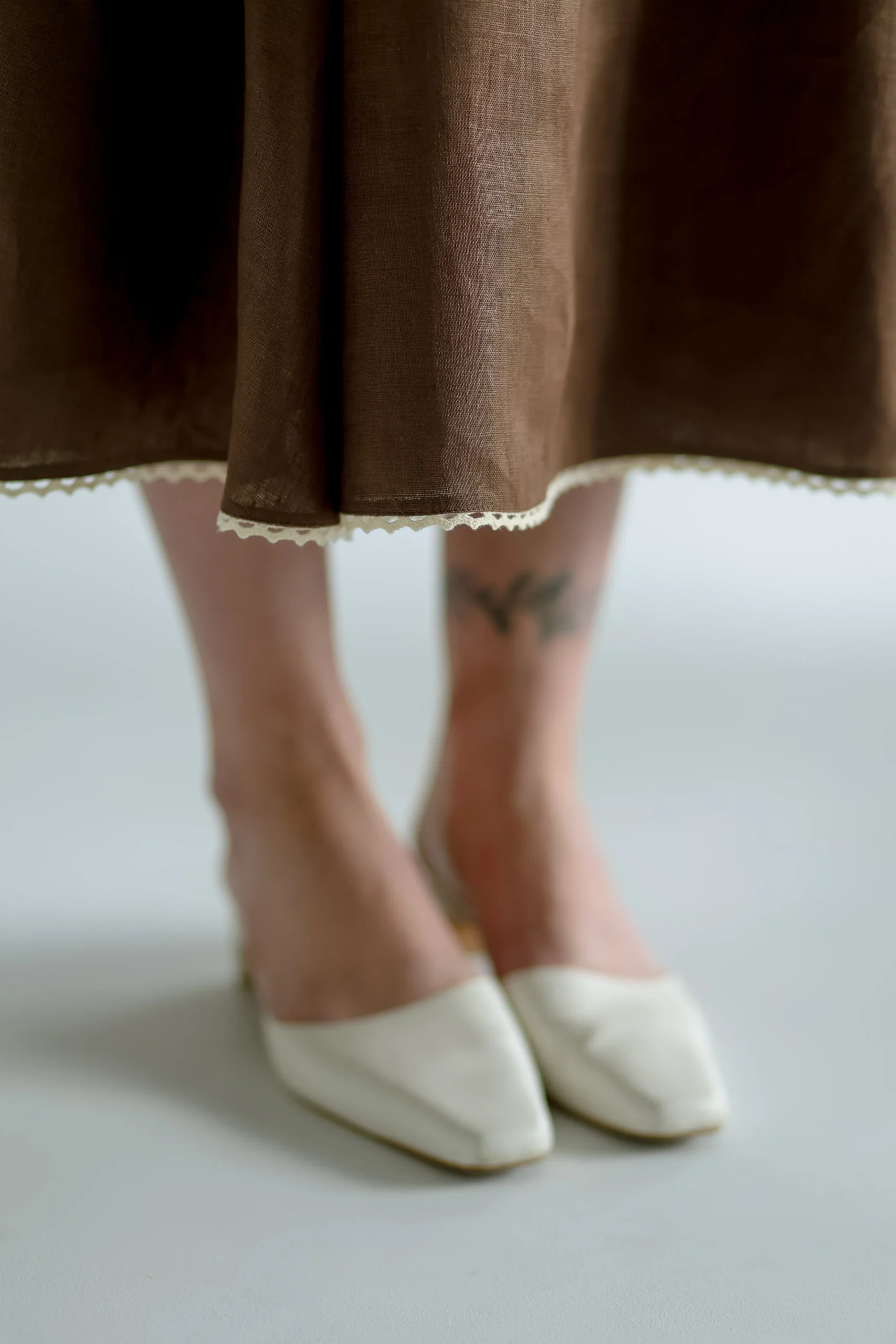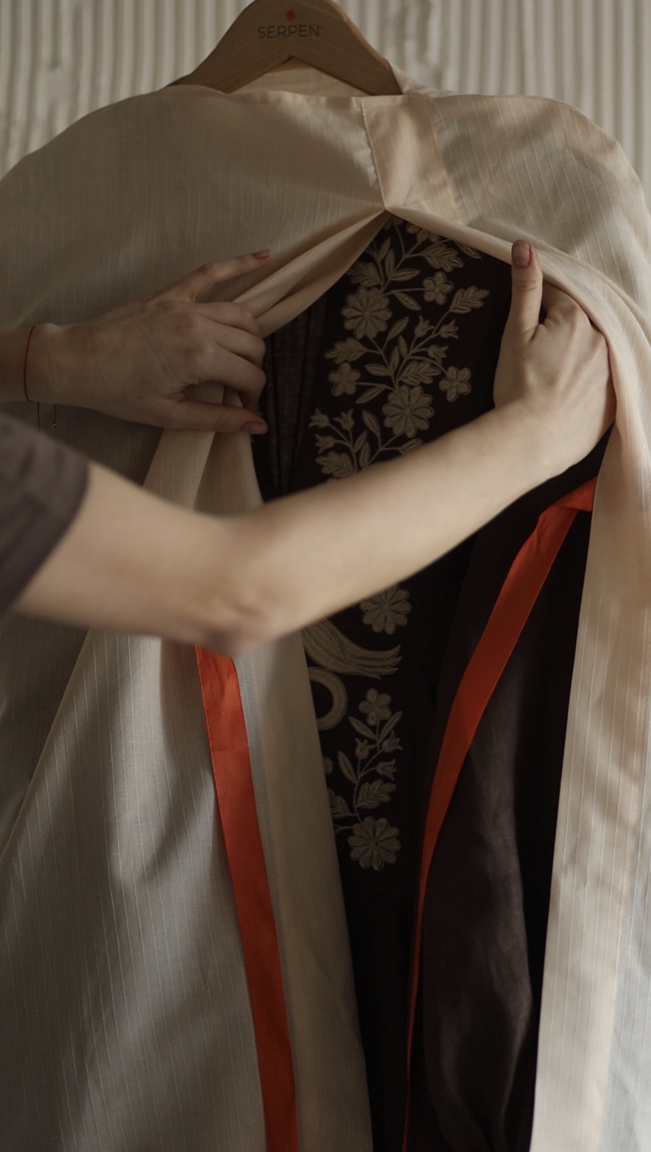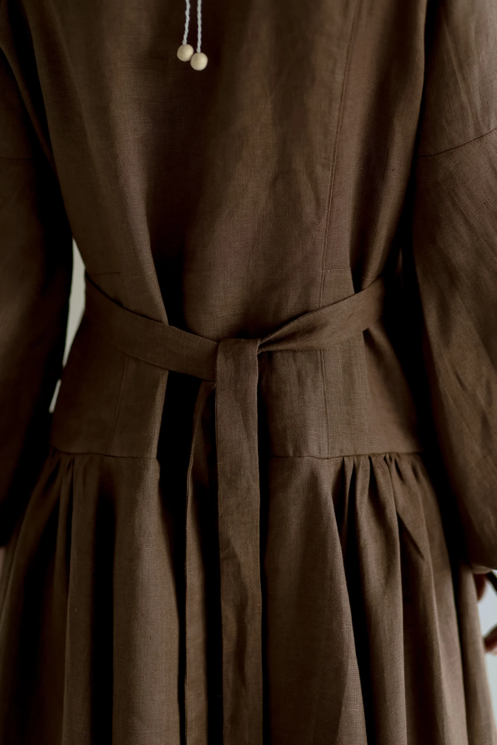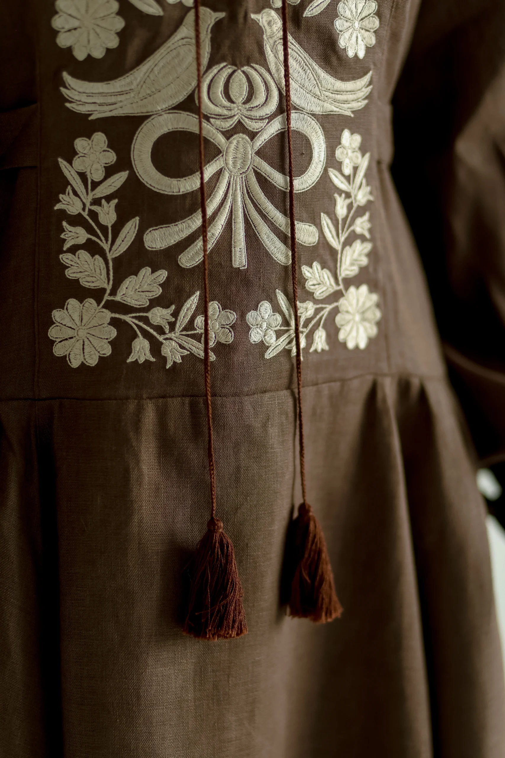Силует сукні натхненний традиційним строєм – із виразною вертикаллю, акцентованим ліфом та розширеною до низу спідницею, що мʼяко тримає форму.