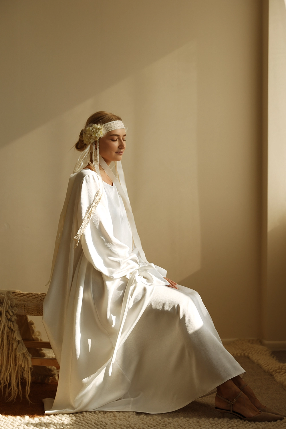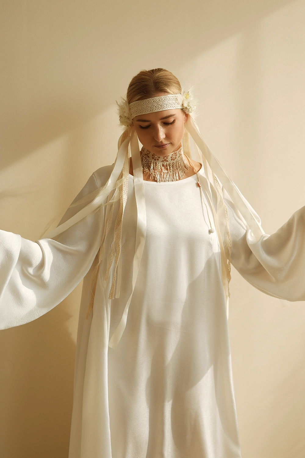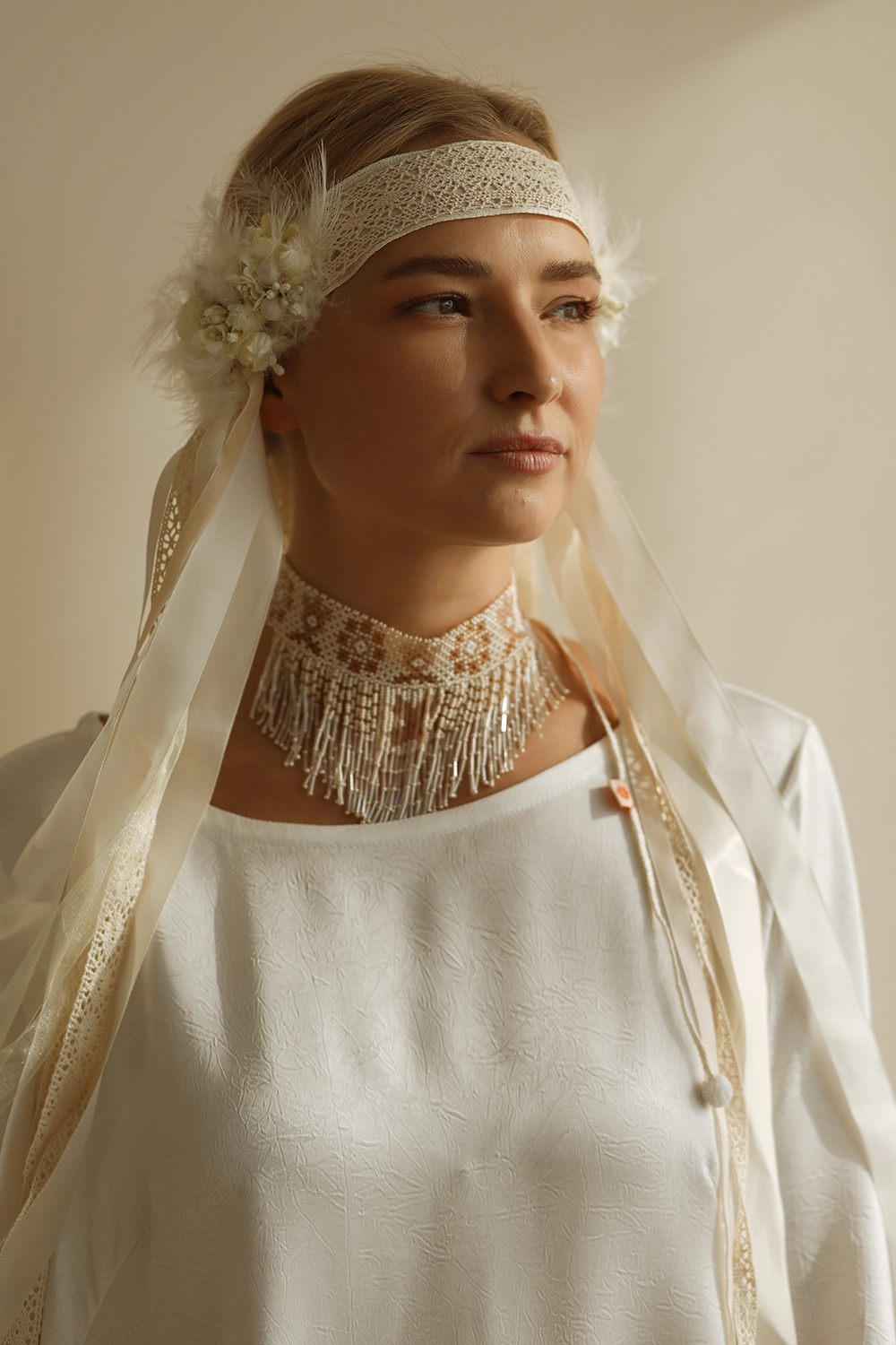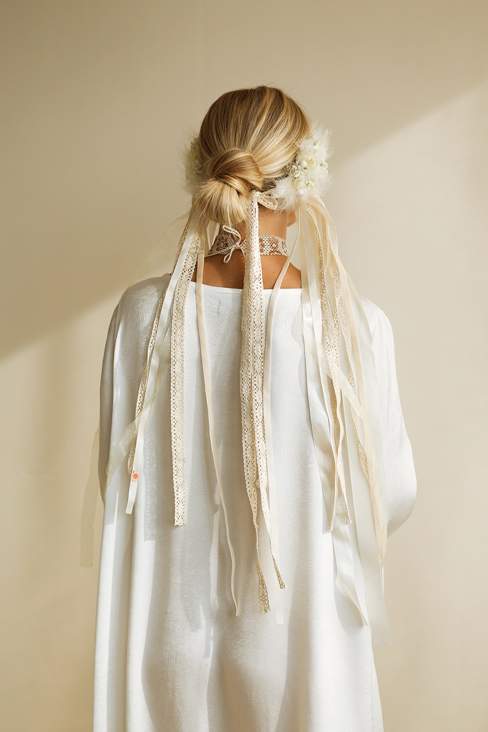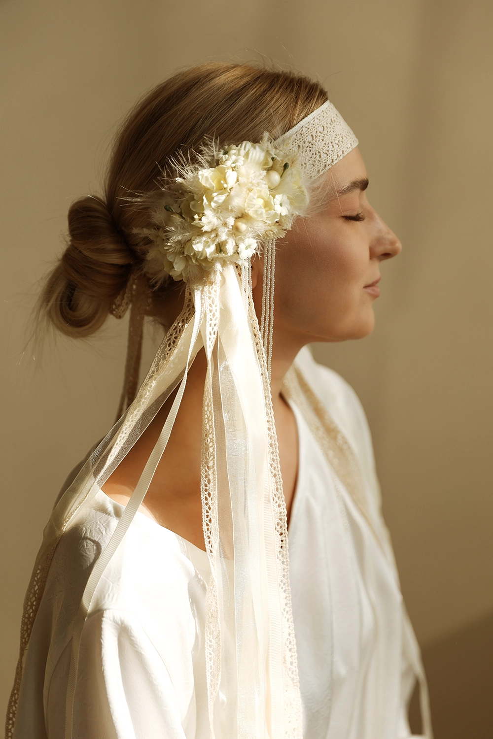 Прикрашений ніжними квітами та довгими стрічками, він пасує як до нео-весільного образу, так і до святкових чи урочистих подій.